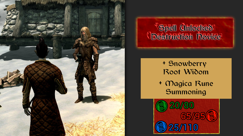 I raised my arm to cast again without thinking. I was tired, but I still had the symbols in my mind. When I focused on them, the smeared ink and gaps in the marks glowed as if they were still fully drawn out. I wasn’t casting without runes. I could create them with my own magicka. The tome mentioned that this was something I should practice, a basic element of all spellcraft that came from the alteration school. Rune summoning, or channeling magicka into glowing patterns, would help me to memorize the spell’s inner arithmetic, but I had no idea I could do it at all. It reminded me of my visions of my spell. The flames spell flowed through me again, but this time I knew better how to control the flow.