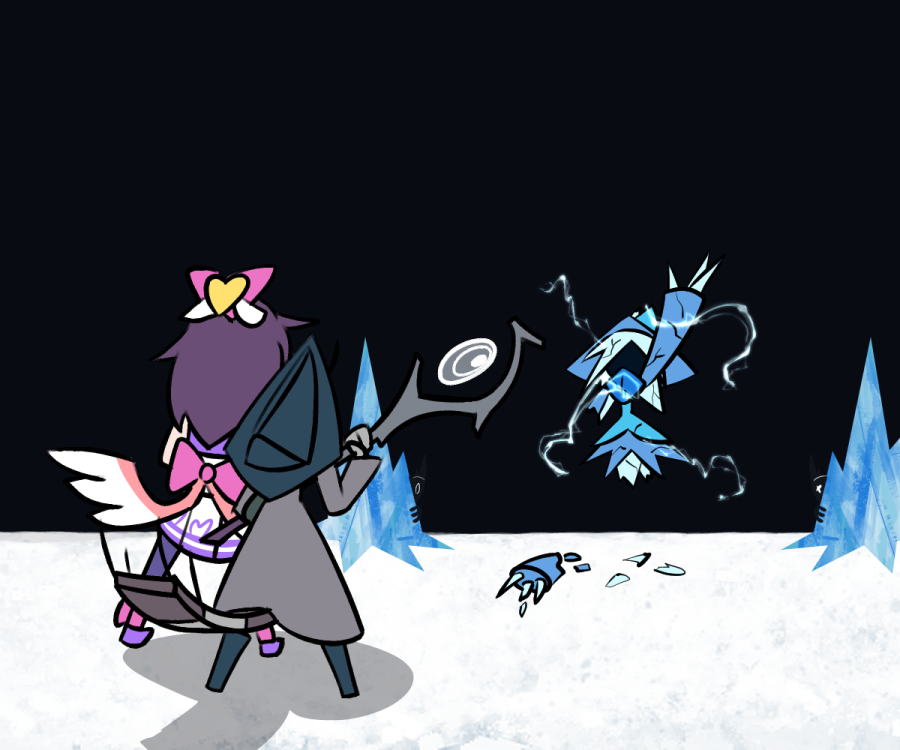 Traveling back to where Mel was staying, you notice that the air, while still cold, has warmed significantly. Seems that without Frozlynn, the perpetual cold and ice is going away. Hopefully this means home won’t be frozen when you return.