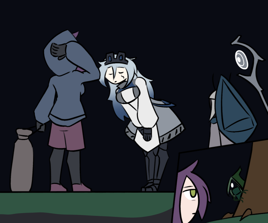 Silv puts the supplies and runes away, and gives Mel a tour of home, introducing the Voidlings and Fern. Fern is shy, and peeking from behind a tree.