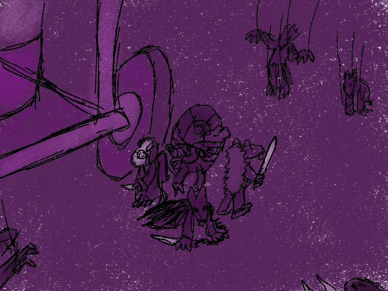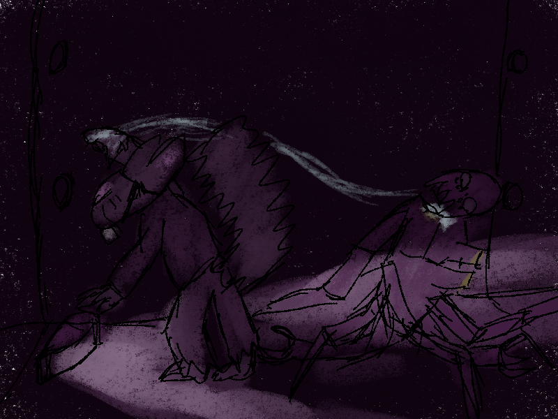 Cedric isn't doing any better. Though blinded, the spider's wild swings are still a threat. One pointed limb jabs into the mouse's thigh before he can get some distance, and he falls with a pained cry. The whips his head towards the sound, and collapses onto all eights. Stabbing his arms around himself, he crawls towards Cedric. A blade pierces the mouse's calf as he tries to scramble away, and the spider hauls himself up to loom over him.