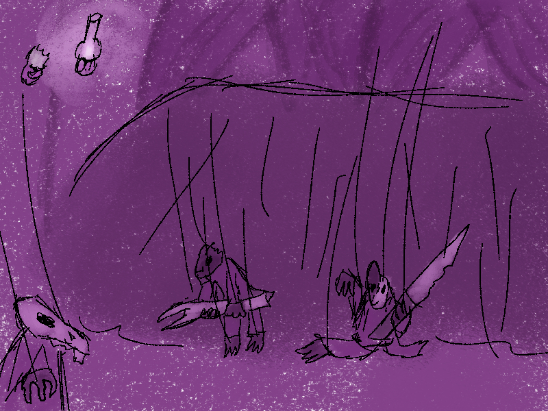 The bat snatches her hand away, blinking at the crimson on her claws. "Ah, no I... sorry I just. The thought of being caught. trapped." she looks from one of you to the other in a panic. "B-but I can't falter here! Can't be useless again. I won't fail you. Like I failed my m-" Sorrel chokes. Tears mix with the blood on her cheeks as she clutches her spear to her like its the only thing holding her up.