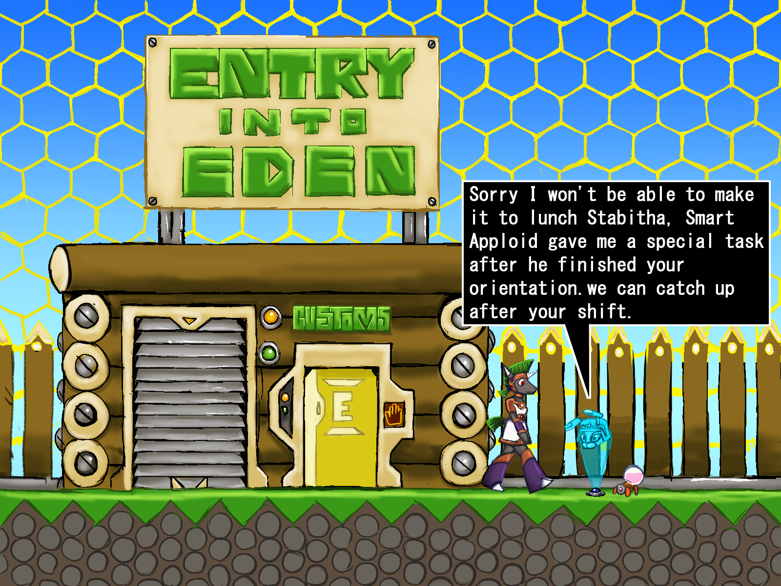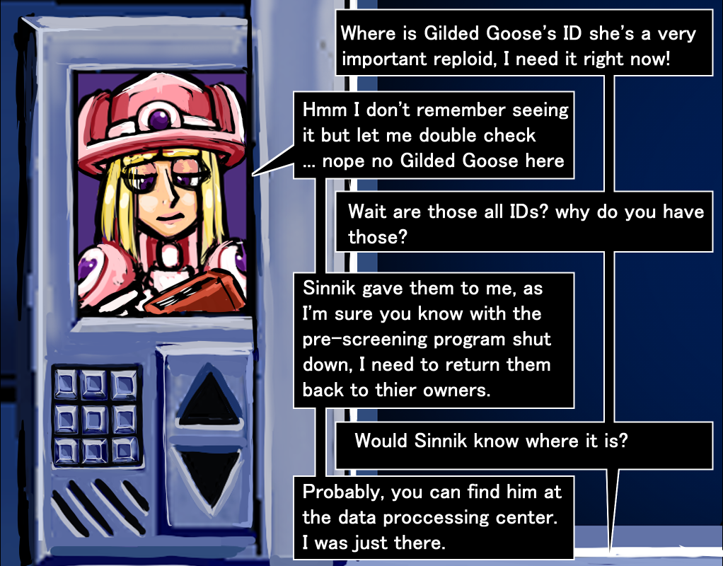 Well, this day just got a whole lot brighter (and shinier)! Not only is the next entrant another reploid, but she's the famous Gilded Goose here to meet us in person! Or an impostor trying to exploit her fame to bluff her way past security. A Maverick Hunter can't afford to let her admiration get in the way of investigating a potential Maverick.