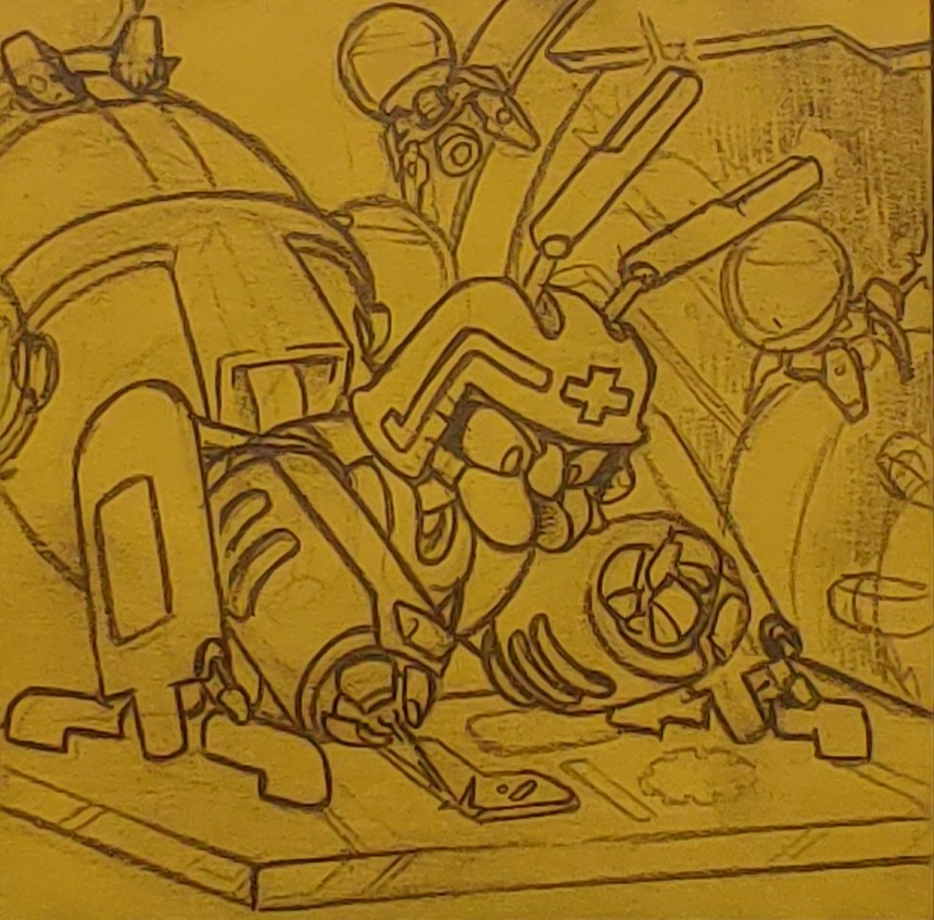 Chemical Formixer dispenses the solvent into a squadron of Aphids, which carry it into the incinerator to deploy onto the areas where carbonized matter was built up. As they do, chemical formixer busies herself cutting the replacement parts from the cured resin sheet. The construction resin is extremely resilient, but Formixer is able to tightly focus the plasma output from her buster in order to slowly cut the required forms and then slowly machine them to appropriate tolerances. It's time consuming work, but Chemical Formixer is a hard worker!