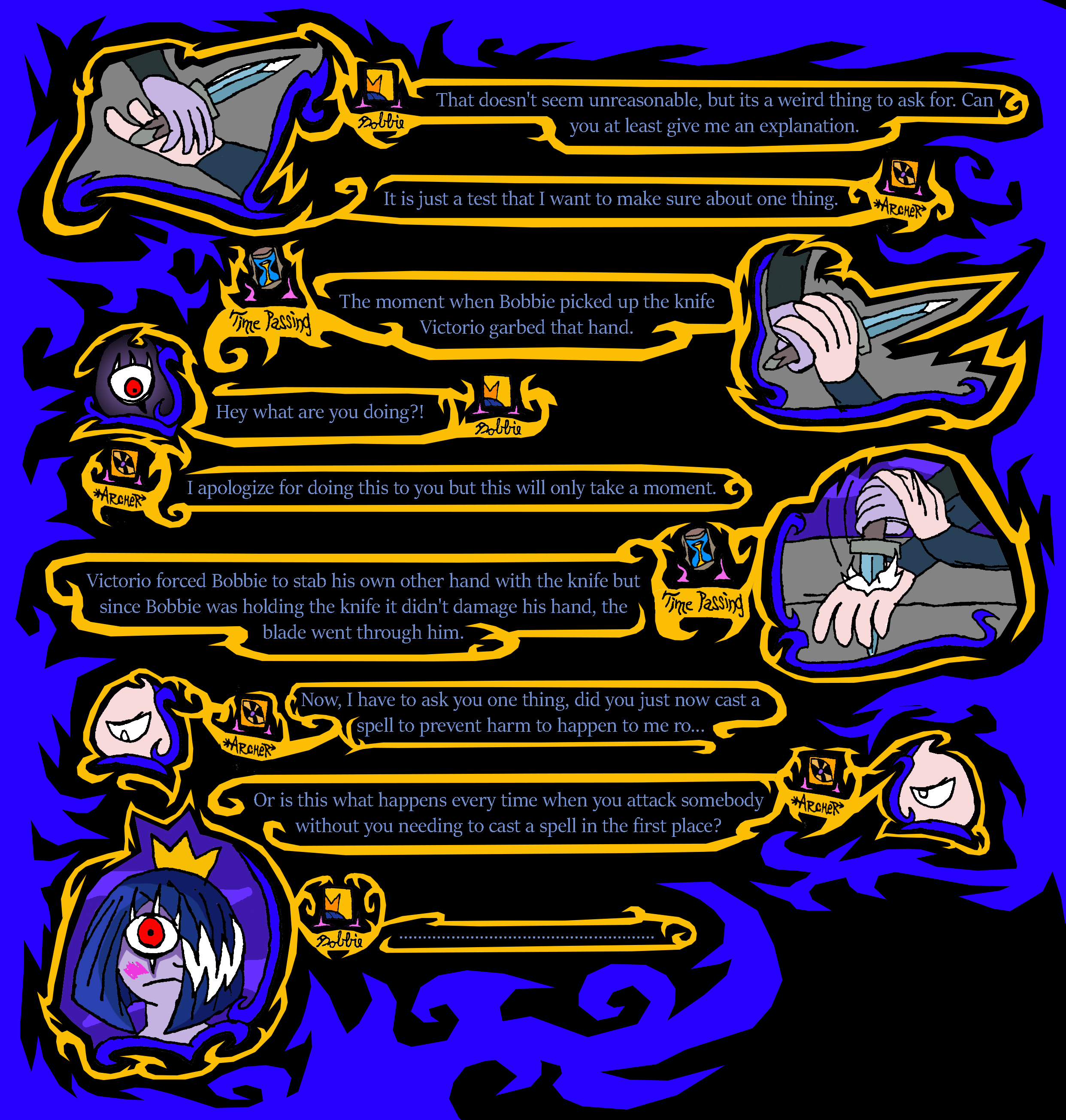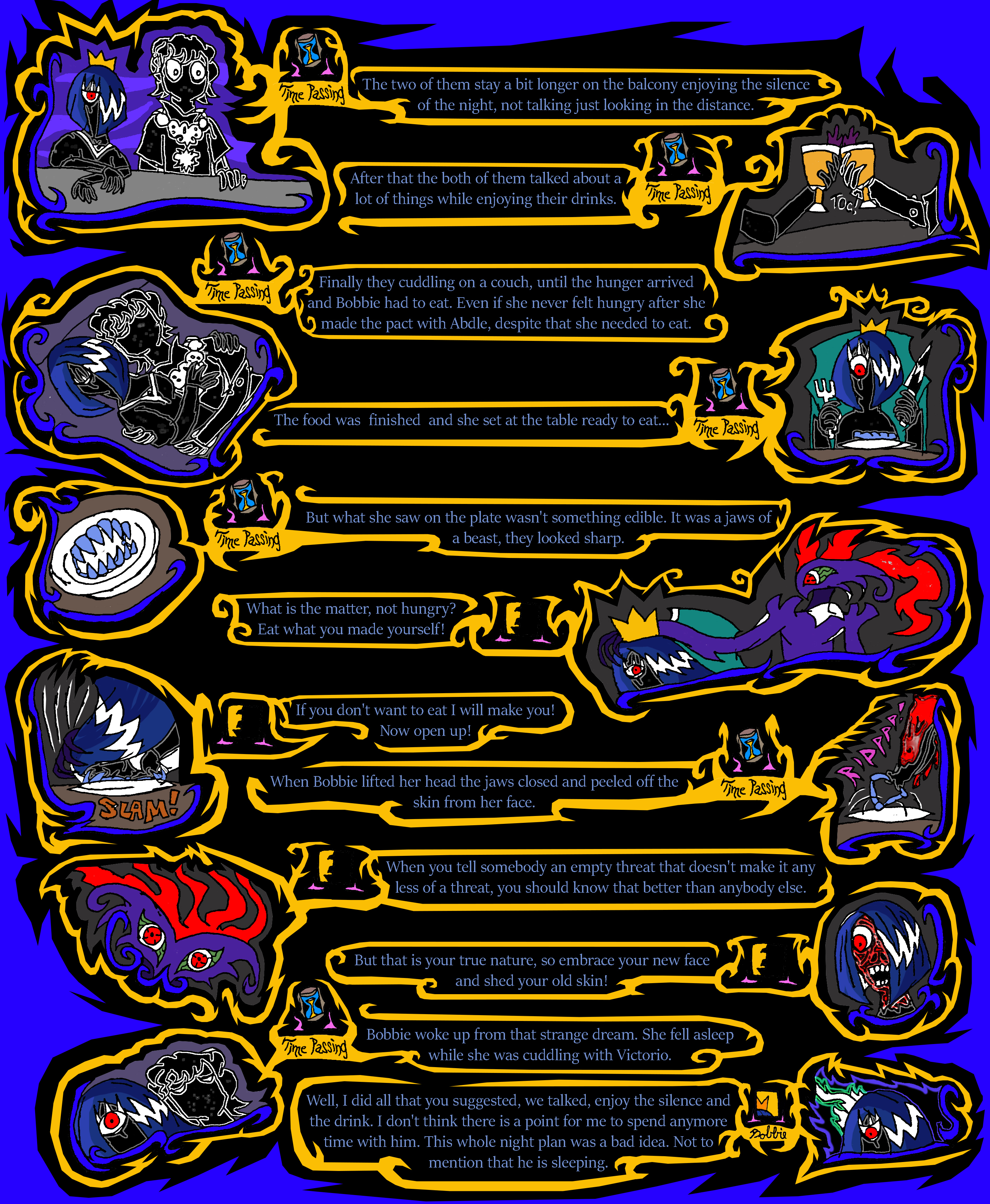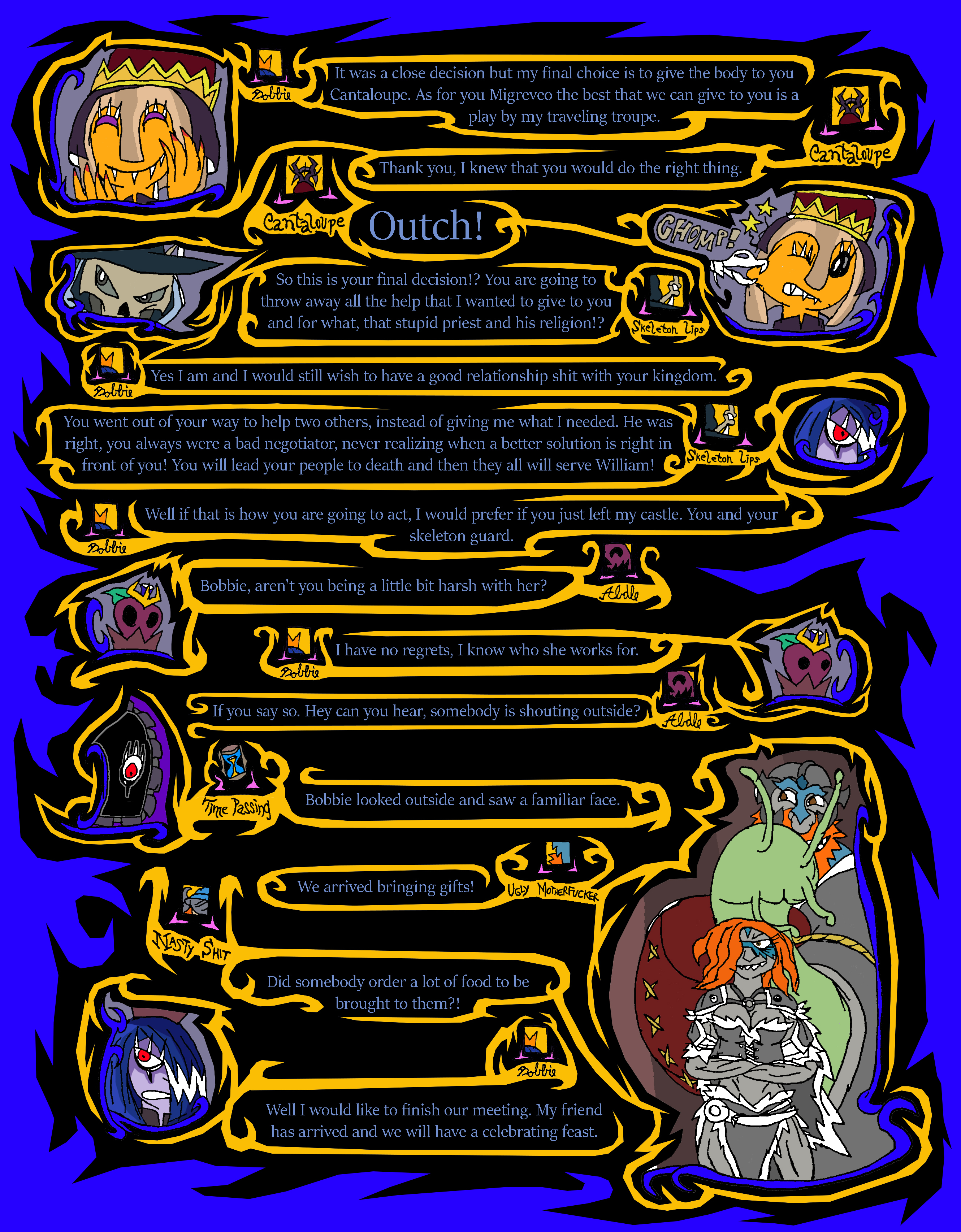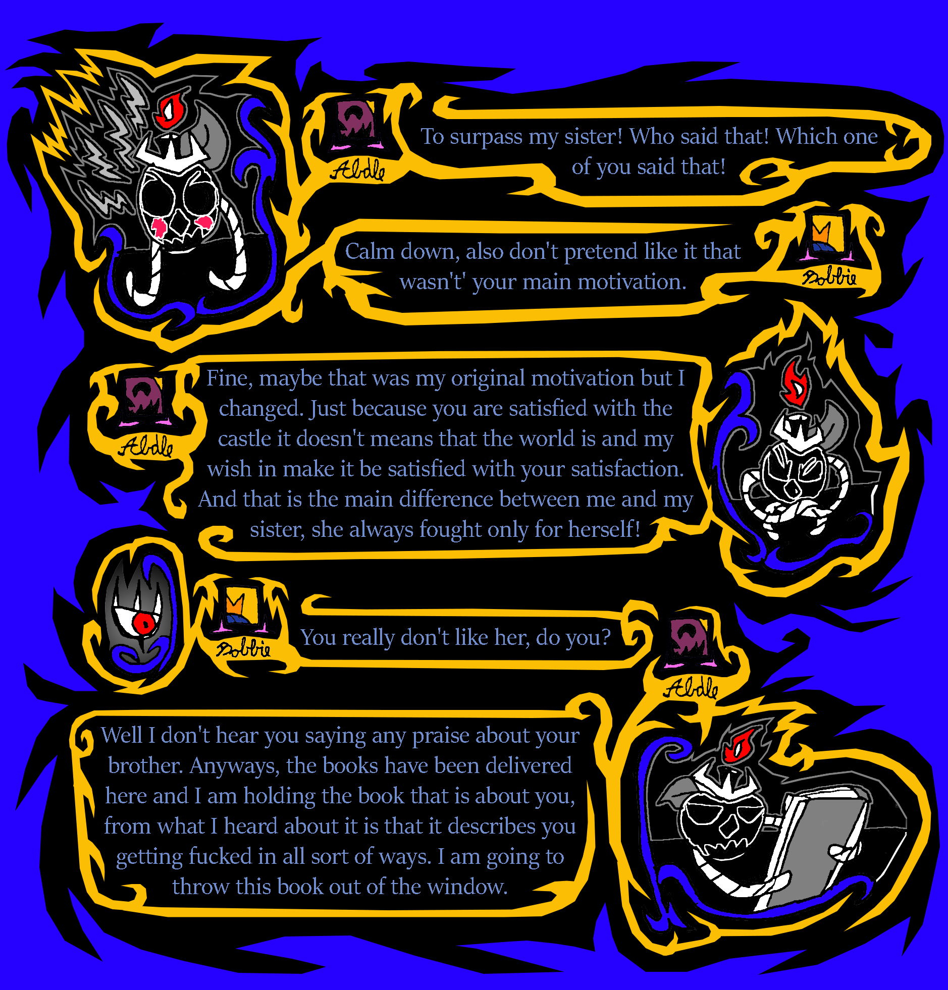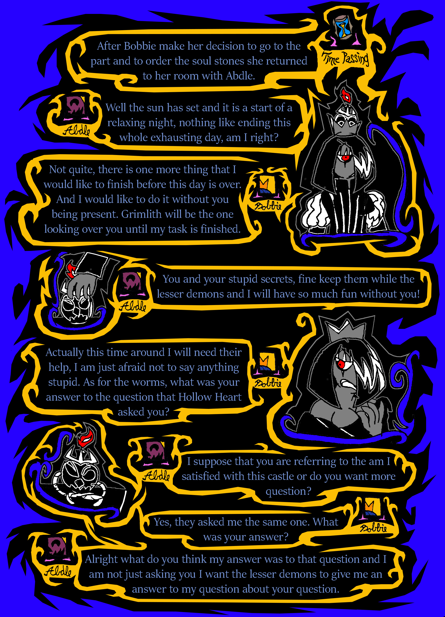 Oh right, Abdle, you'll have to be the one to invite Skeleton Lips instead of Bobbie. Skeleton Lips is a bit angry and Bobbie, and Bobbie isn't too happy with her as well. I think Abdle being the one to personally invite her himself would be kind of a way to get things relatively back on track on keeping things peaceful since he could be seen as neutral not taking any choices, and Bobbie's invite might not sound genuine if she's still a bit annoyed with skeleton lips. Any talking with Skeleton Lips will be with Abdle