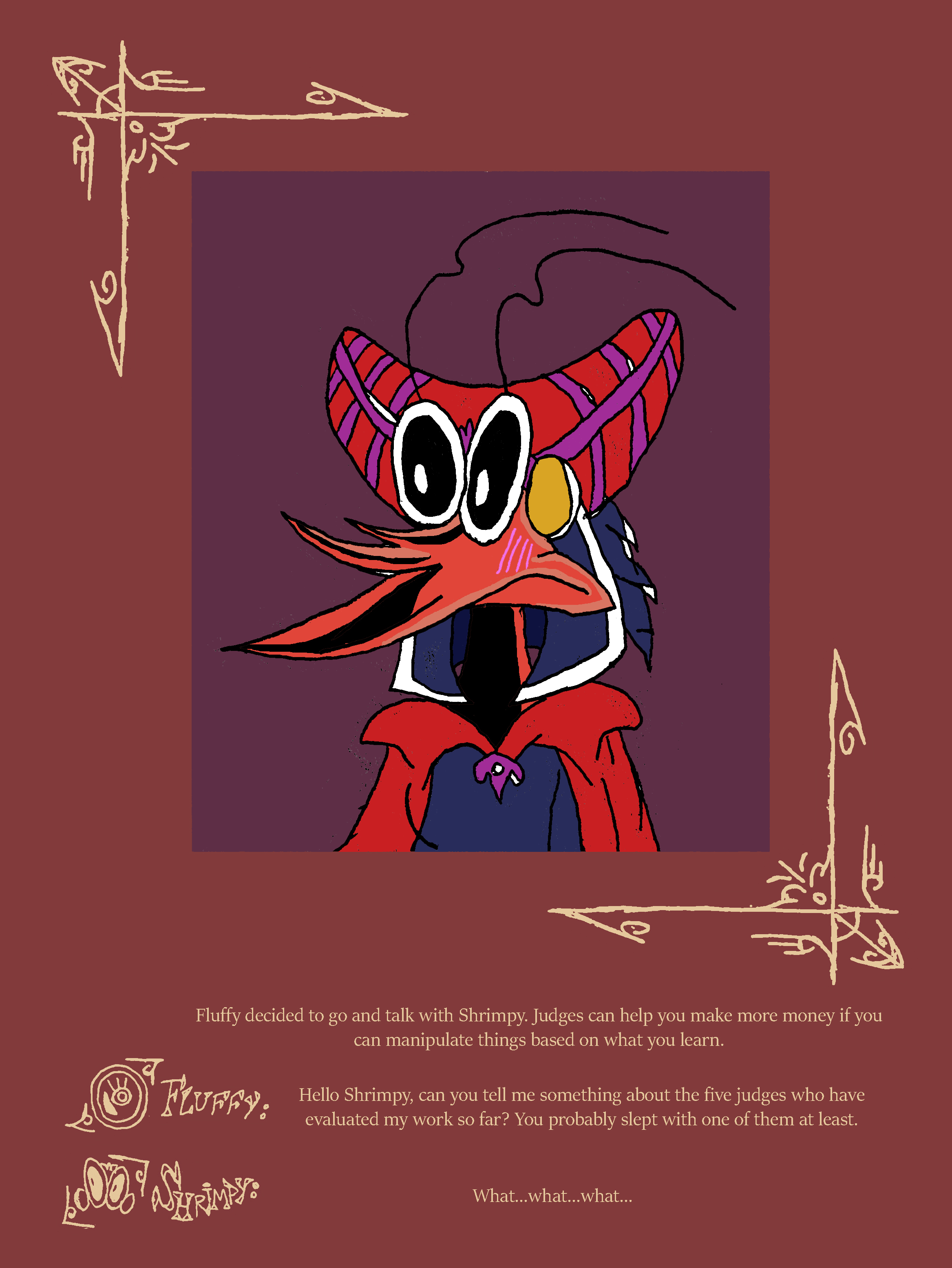 A. Shopping can wait another day. Learning about the judges can help us make more money if we can manipulate things from what we learn. I’m sure she has slept with at least a few of them and knows their secrets
