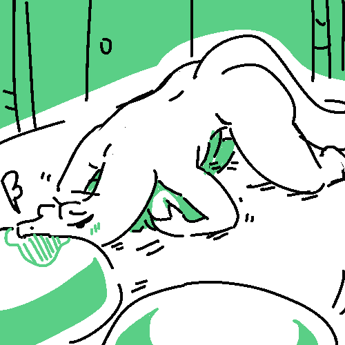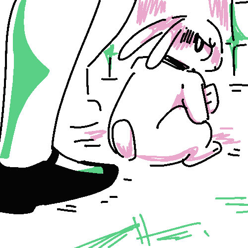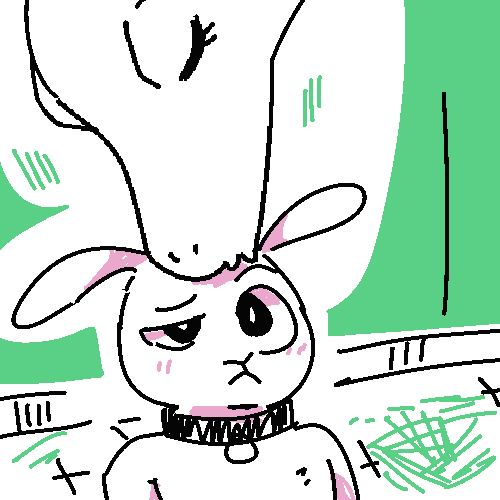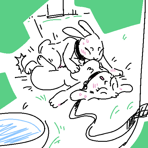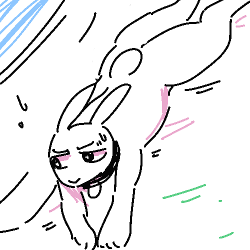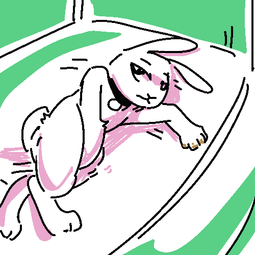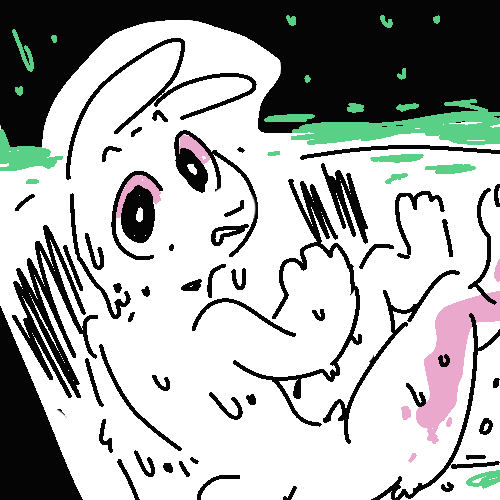 There’s a white rabbit resting under the small overhang–he starts when he hears the door open but doesn’t run. His pale fur is soaked and his right leg is pink with diluted blood.