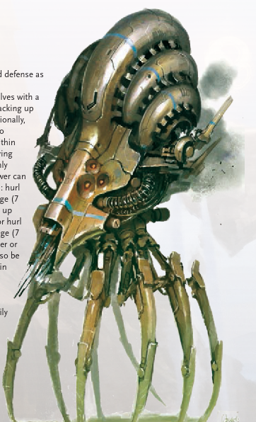 While you're resting up, and talking over those plans, someone else arrives in town, trudging through the snow from the opposite direction you did. Road that way leads past the Orgotek, to warmer lands in the northern Beyond. This newcomer is nearly five meters tall, visible parts entirely mechanical, almost but not quite entirely unlike those spiders under the Eye of the Sea - proportions more resembling a snail or squid.