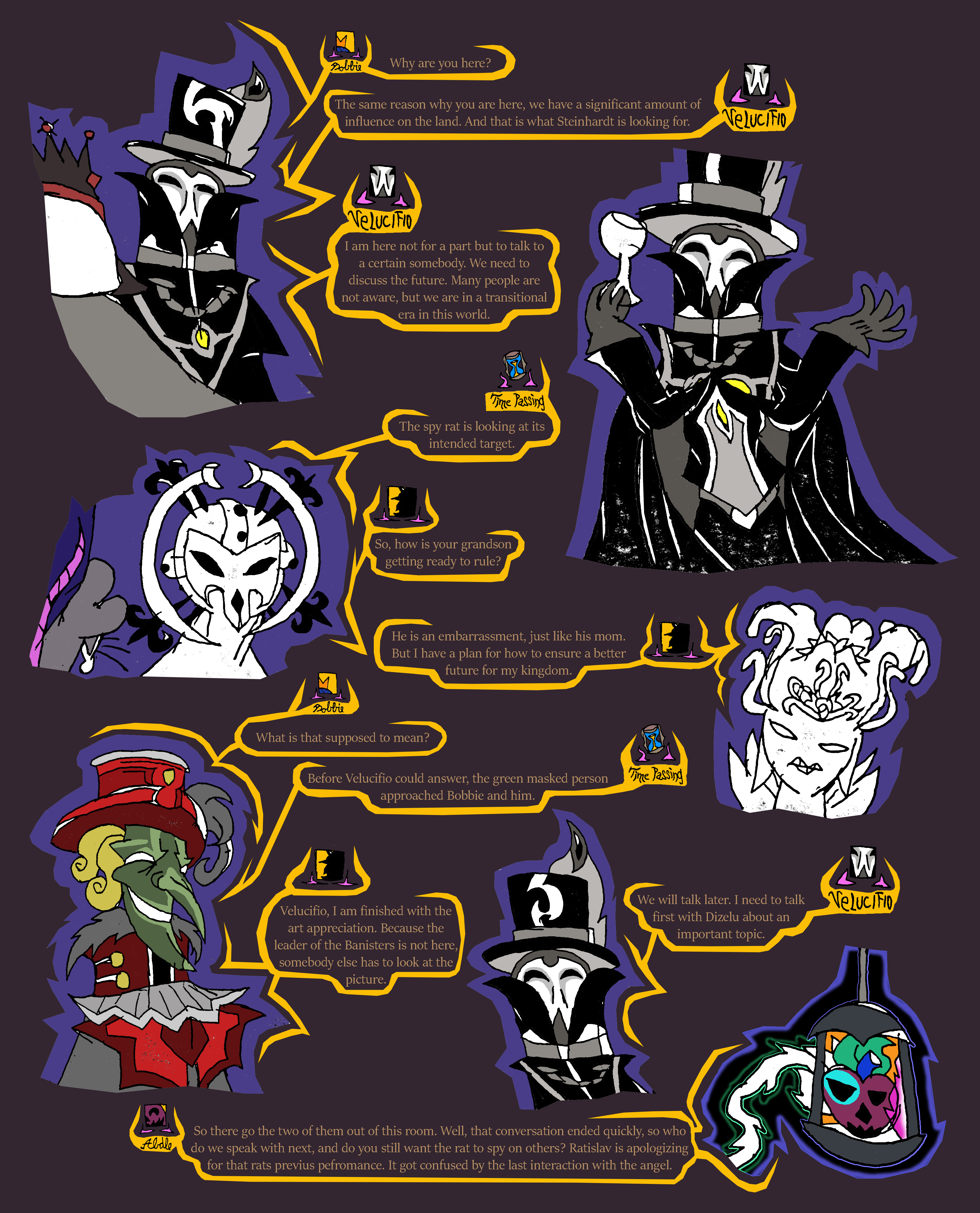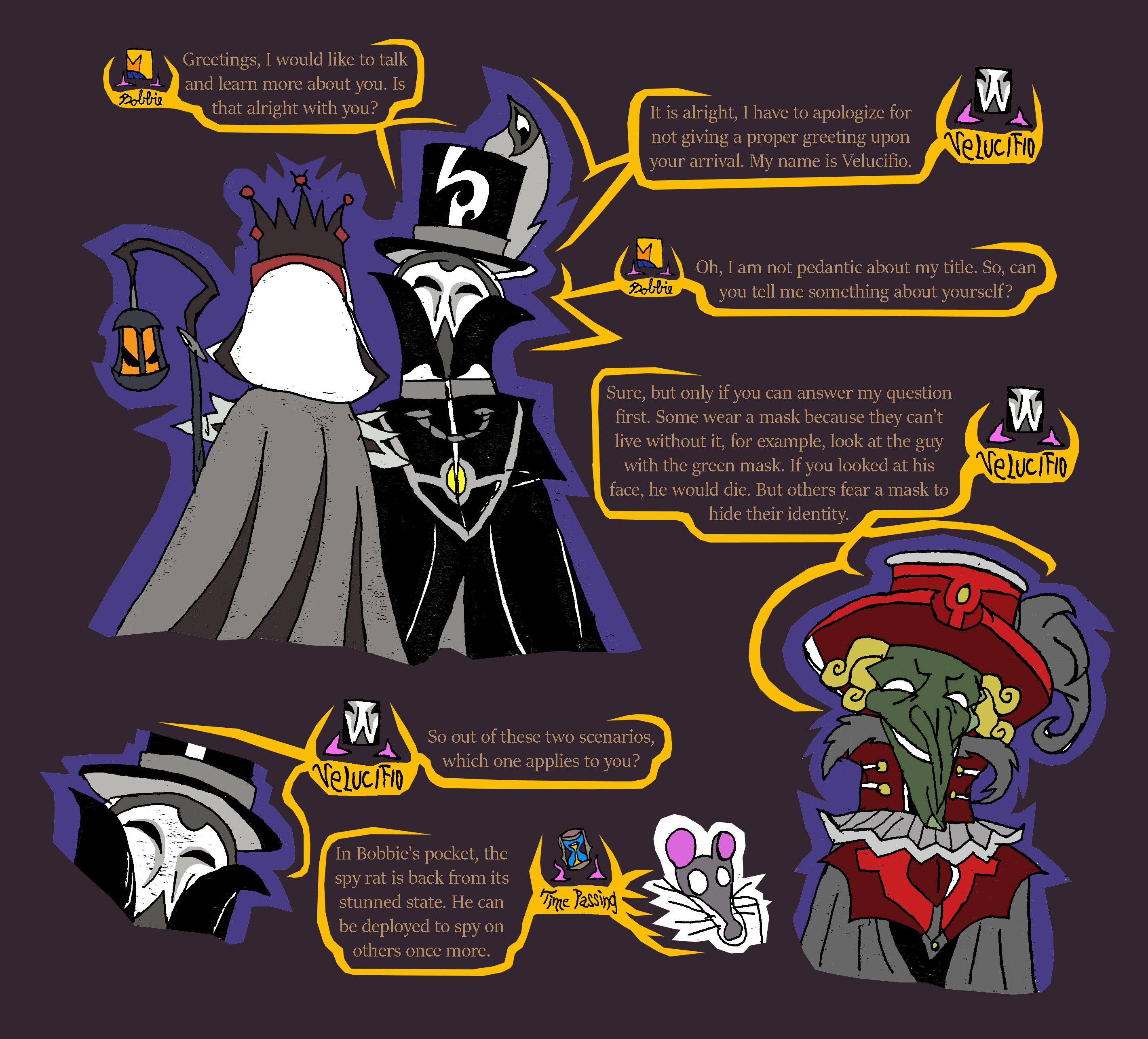 Also, nothing new going on with what the rat is spying on with the mantis and the woman made of stone? Maybe either see what hand signals the woman is stone is making with her hands, or perhaps have the rat come back to us to take a break. I don't know, I just have the feeling having the rat stay out for too long will have him be spotted, especially after hearing that warning Actus made, and the death of some of our spies to the cat. Leaning towards calling the rat back to us