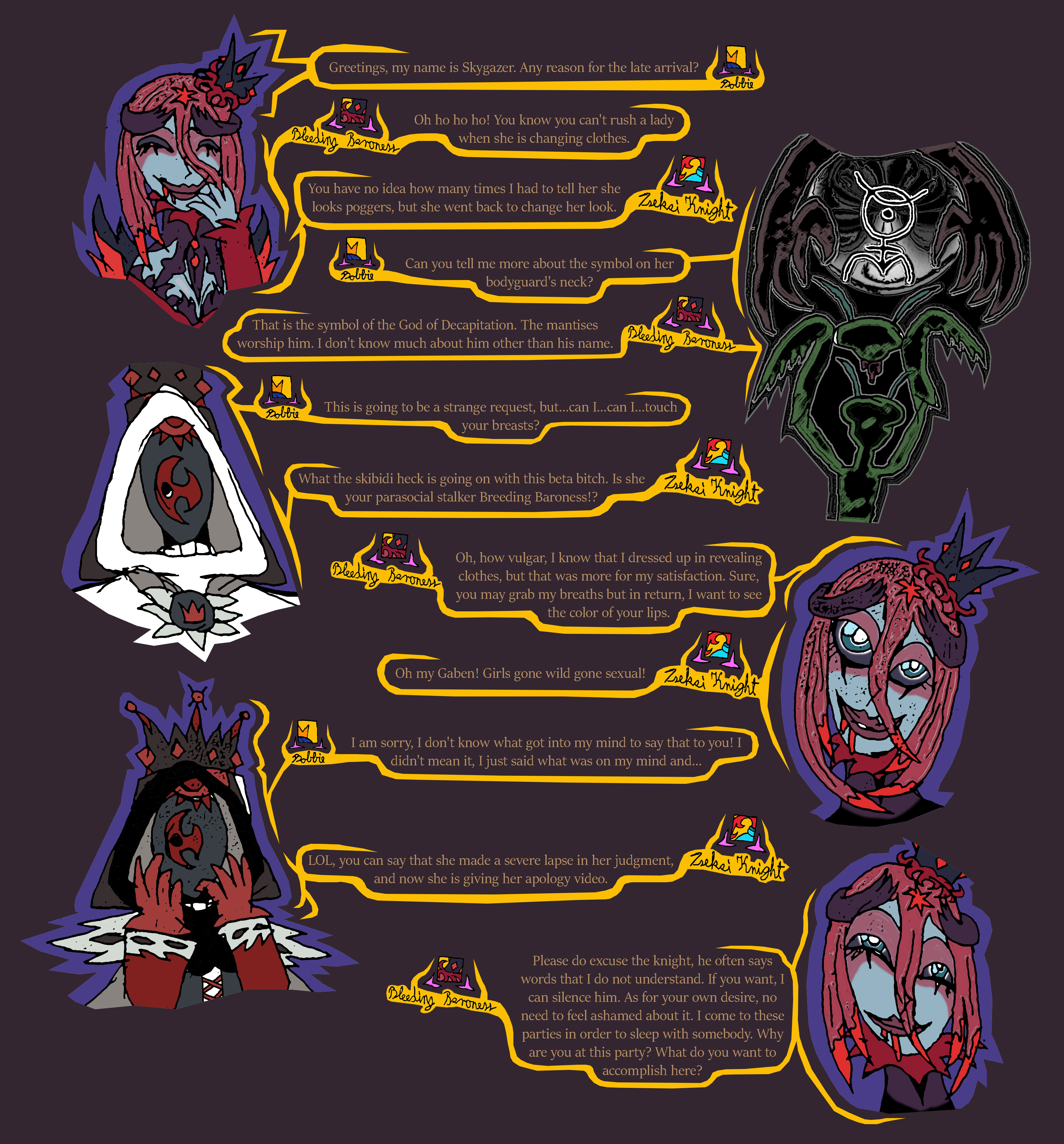 Mantis: crying over her daughter cutting ties with her after refusing to marry, have sex, and eat the head of her future lover. she can't speak our language, the stone servant can translate, but is pretty cold.