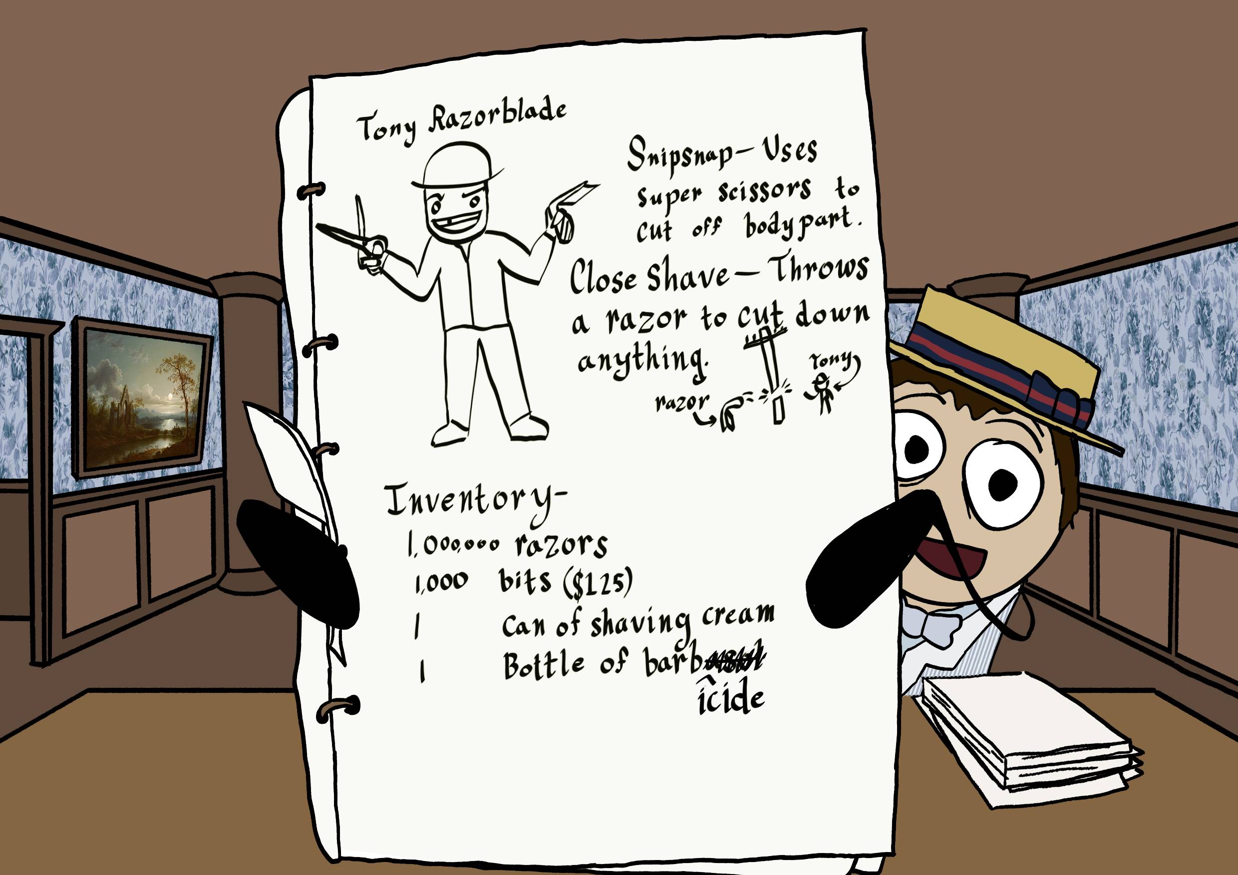 "This will be my hero, Tony Razorblades--A two-bit thug charging three bits for a shave and haircut. Now, you get to decide on yours. I wouldn't spend too much time on it, or get too attached. I'm pretty good at this game."