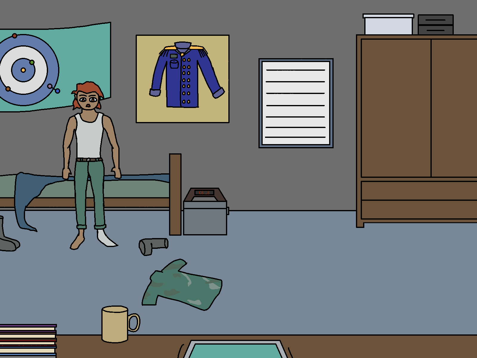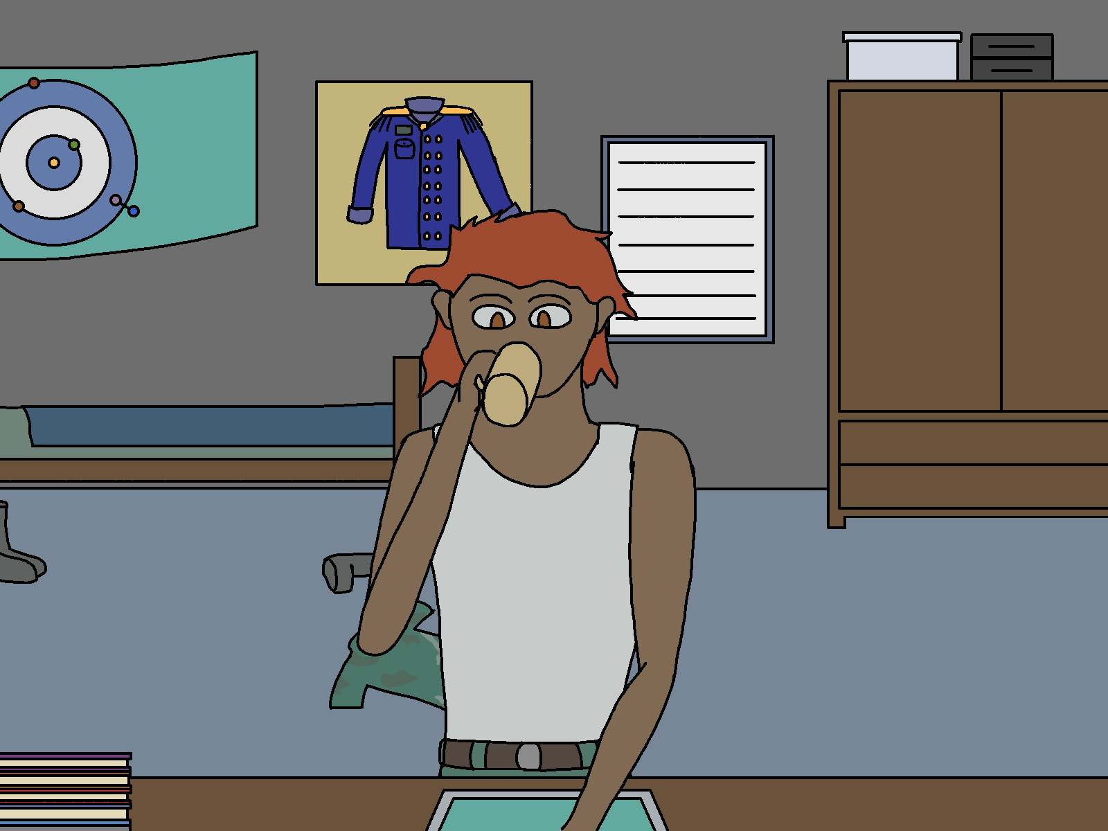 Ah… that’s the formalwear for officers, used for celebrations and the sort. I only got to use it like once or twice, last time was yesterday, on the graduation ceremony. Soon after, I came back here to change to my backup uniform, because I knew I was going to get trashed in the… “after party”. I didn’t want it to get stained. I still needed to get the rest of the uniform framed, but I liked the top more... a Shame I don't get to use it that often.