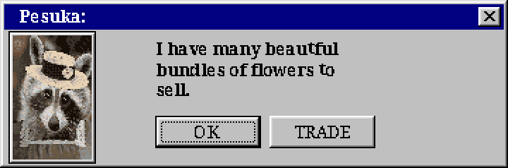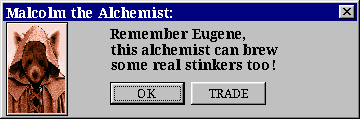 Malcolm: “Hah-hah-hah! Oh but Eugene, her majesty isn’t the one paying me for it. I’ve got a few other orders to finish up this morning. ”Where did I put that bottle of tree’s beak… Ah never mind. If you care to bargain for a moment perhaps we can work something out. I can brew up your usual order and some special ‘wine stain’ remover for twelve gold, three copper, top priority.”