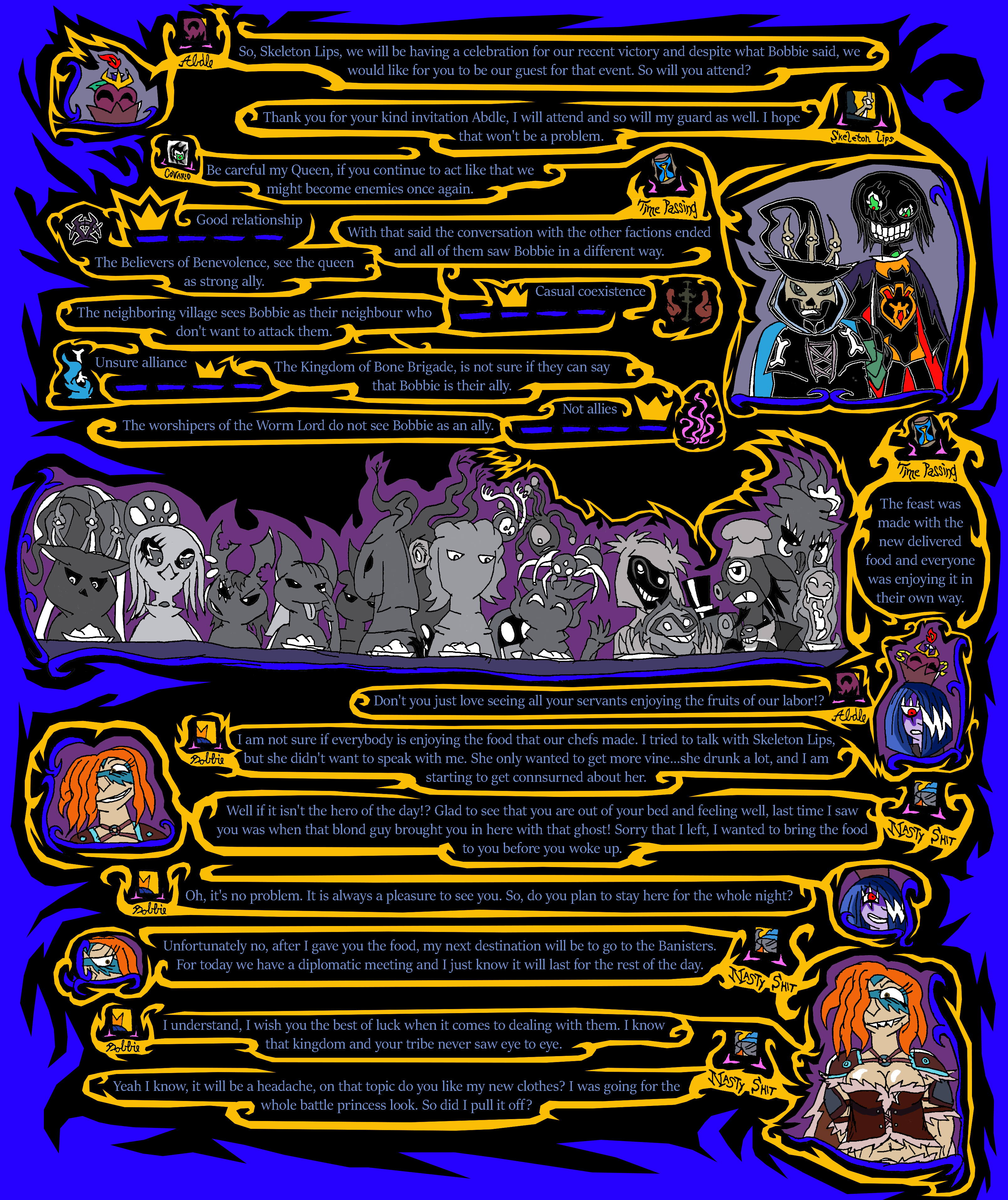 Oh right, Abdle, you'll have to be the one to invite Skeleton Lips instead of Bobbie. Skeleton Lips is a bit angry and Bobbie, and Bobbie isn't too happy with her as well. I think Abdle being the one to personally invite her himself would be kind of a way to get things relatively back on track on keeping things peaceful since he could be seen as neutral not taking any choices, and Bobbie's invite might not sound genuine if she's still a bit annoyed with skeleton lips. Any talking with Skeleton Lips will be with Abdle