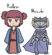 Two friends that joined a raid party made of Slimecrown veterans. Marauder is a pint sized tank and competent leader. Basically Warrior, but better in every way. Cleric is a part-time healer and full-time pessimist.