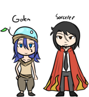 A bored office office worker intending to sweep the dungeon easily and his companion that does the actual heavy lifting. Golem was the first opponent to survive even a single attack from Jeffrey.